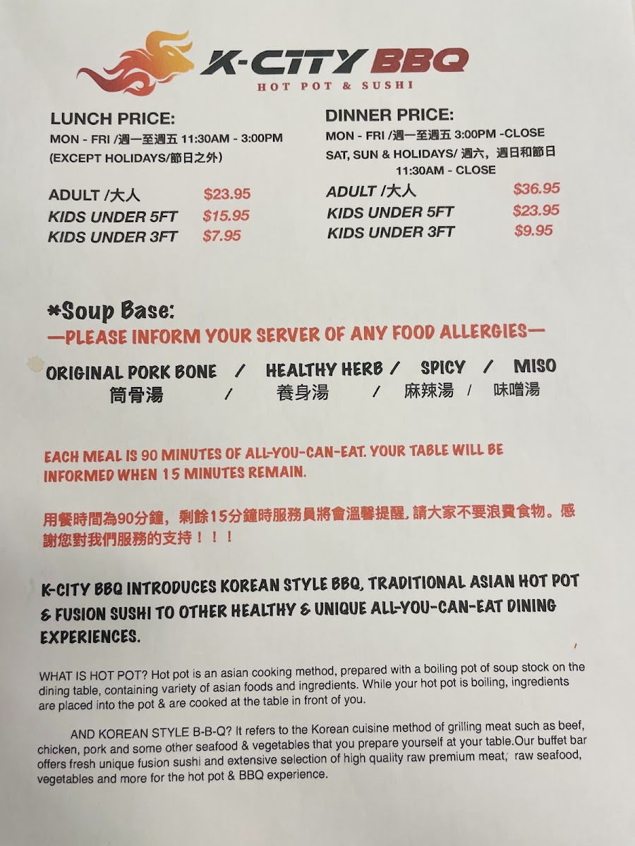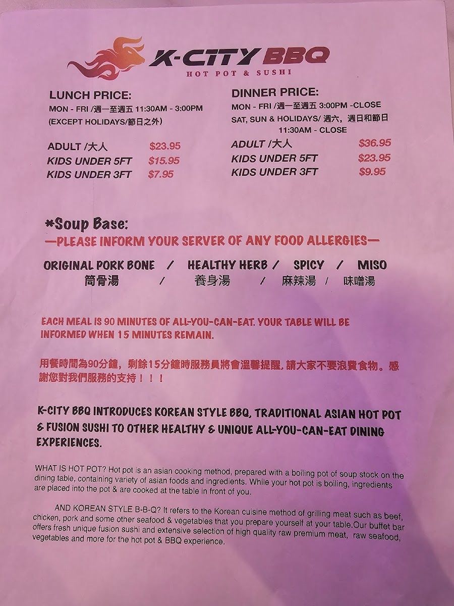 K-CITY BBQ Hot Pot & Sushi offers an extensive menu that showcases the best of Asian cuisine. Dive into their tantalizing Hibachi offerings, featuring standout dishes such as: